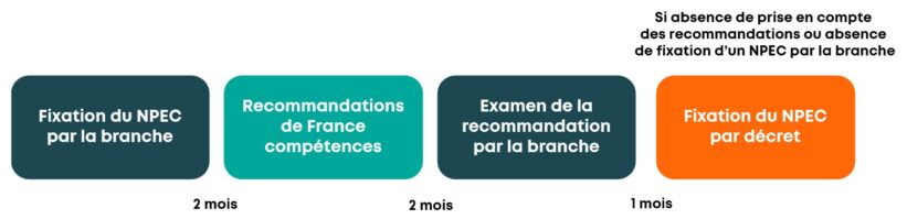 Jusqu’alors, les branches professionnelles déterminaient, pour chaque diplôme ou titre, un NPEC qu’elles transmettaient à France compétences dans un délai de 2 mois. L’institution nationale formulait ensuite, dans un délai de 2 mois, des « recommandations » et les branches disposaient d’un mois pour les prendre en compte. À l’issue de ce délai, si les branches professionnelles n’avaient pas déterminé de NPEC ou n’avaient pas suivi les recommandations de France compétences, le niveau de prise en charge applicable était fixé par un décret.